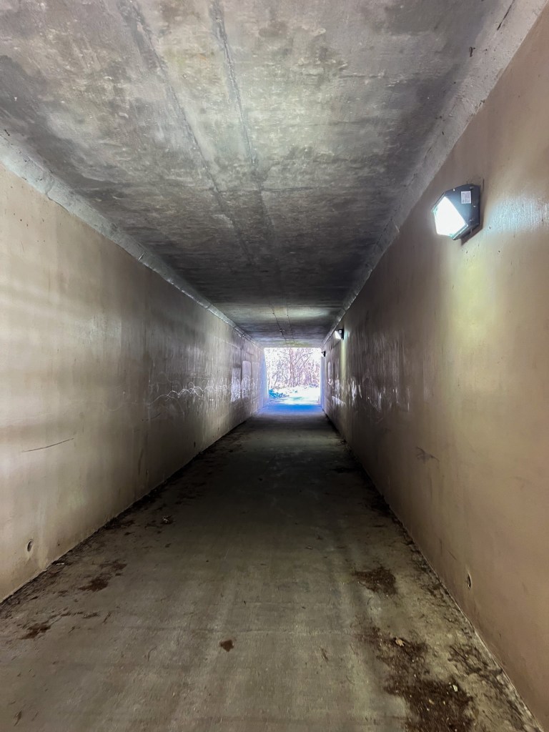 The trail is paved asphalt and 10-feet wide. It includes wooden bridges, tunnels that serve as underpasses for busy highways, and street crossings.